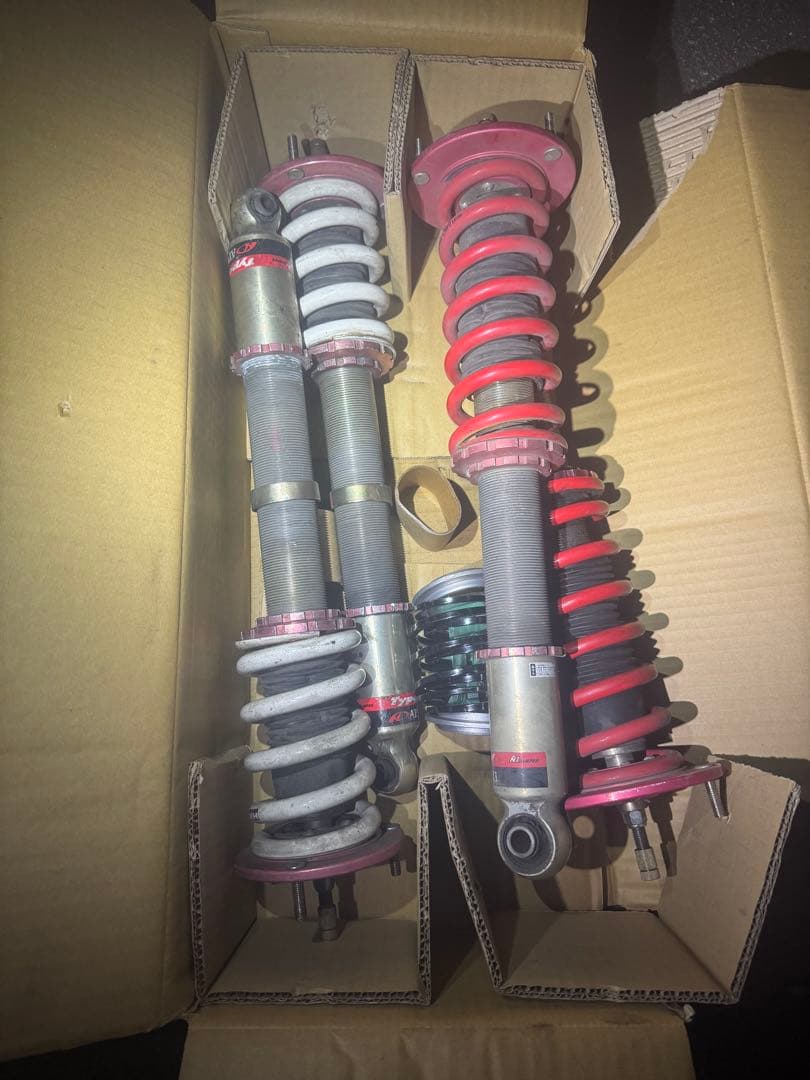 80ヴォクシーから取り外した車高調の中古になります。hksスタイルCになります。傷や、汚れあります。ショックの抜けはなさそうですが、外して確認してないので、保証できません。画像2枚目の左前側のサスに擦れたような後があります。(ステッカーのあたり)3枚目はざっと水洗いした後の写真になります。写真にて判断お願い致します。。CR-Z ZF2 無限 サスペンション。プリウス50 車高調 BLITZ ID62。カムロード エアサス クライム。ランチアデルタ エボ用 アラゴスタ車高調 type-E 特注品。MILDダンパー サスペンションキット 一式。★N-BOX JF1 ダウンサス RS-R★。MK54Sスペーシアダウンサスレビュー